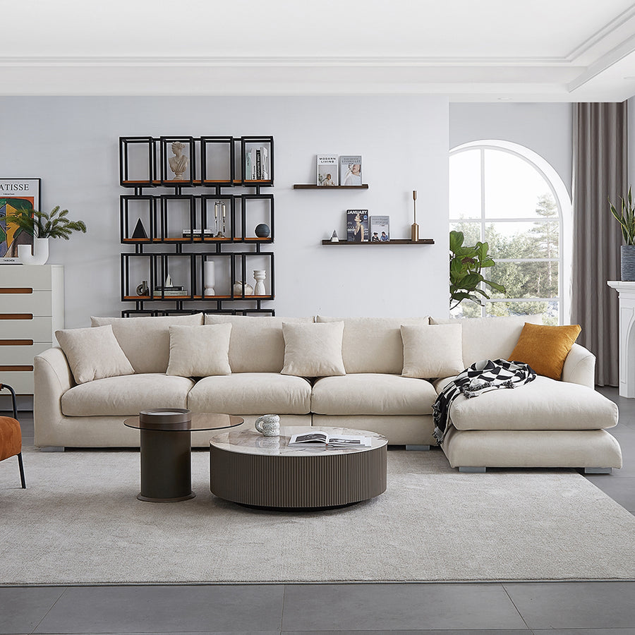 The Aalto Boutique White Plume Sectional is ideal for those who like to stretch and be comfortable or want to entertain many guests since it has lots of room. It is aesthetically appealing and relaxed, making it a perfect choice for family dinners, watching movies, or reading a book silently.